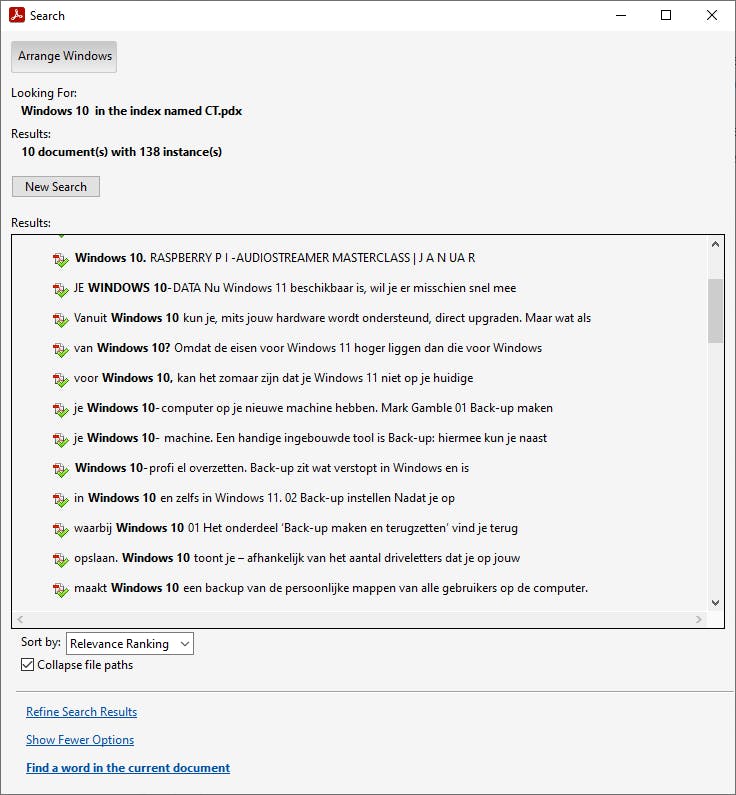 Wanneer de zoekfunctie wordt geopend, kun je via Adobe Reader een of meerdere zoekopdrachten invoeren. Let op: open je de zoekfunctie direct vanuit het startprogramma op de usb-stick of dvd? Dan kan het voorkomen dat het zoekvenster van Adobe Reader achter het hoofdvenster van Adobe Reader terecht komt. Gebruik in dat geval de toetscombinatie Alt+Tab om het zoekvenster van Adobe Reader naar de voorgrond te halen. Ook kun je eventueel op de knop Vensters herschikken (Engels: Arrange Windows) klikken om alle vensters opnieuw te rangschikken.