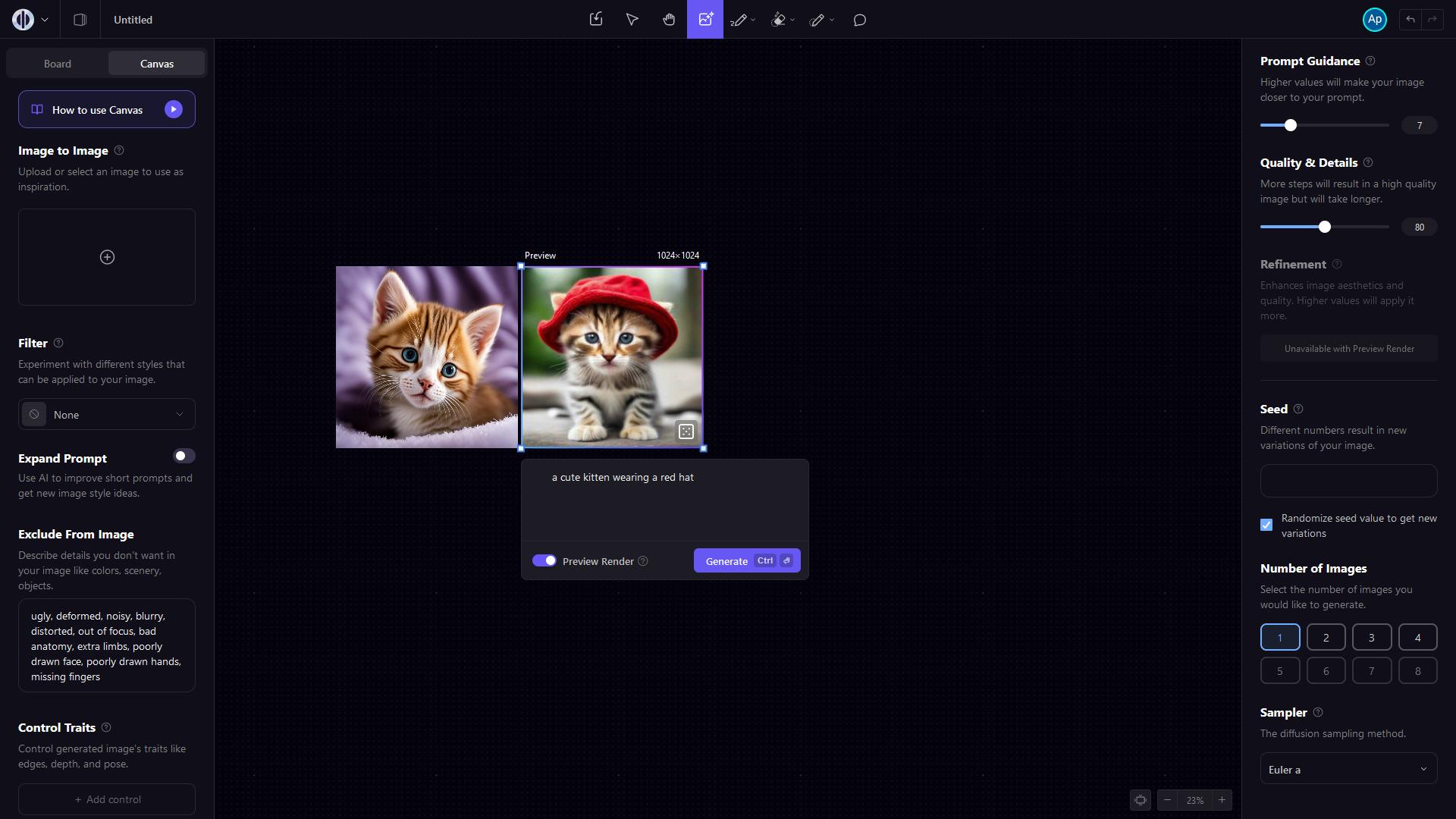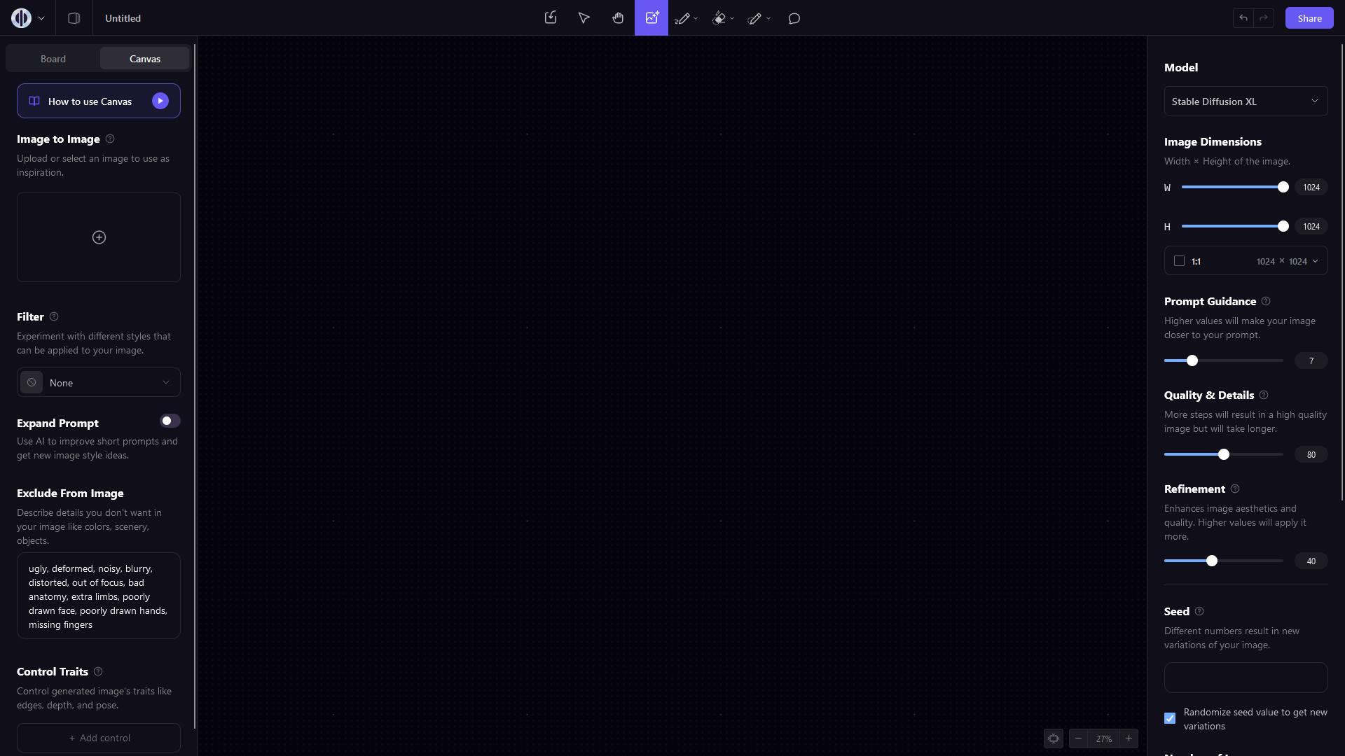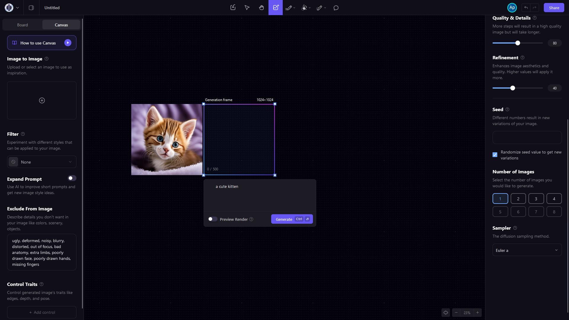 De schuifjes voor Prompt Guidance, Quality & Details en Refinement hebben allemaal invloed op de kwaliteit van de gemaakte afbeeldingen. We komen hier later op terug.