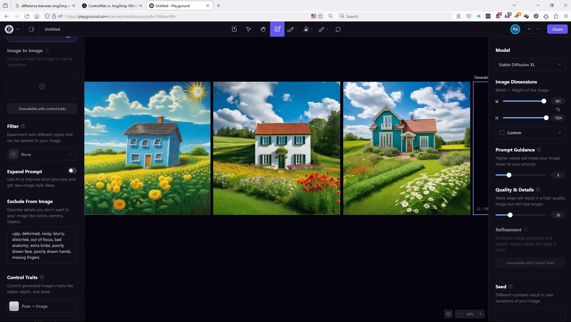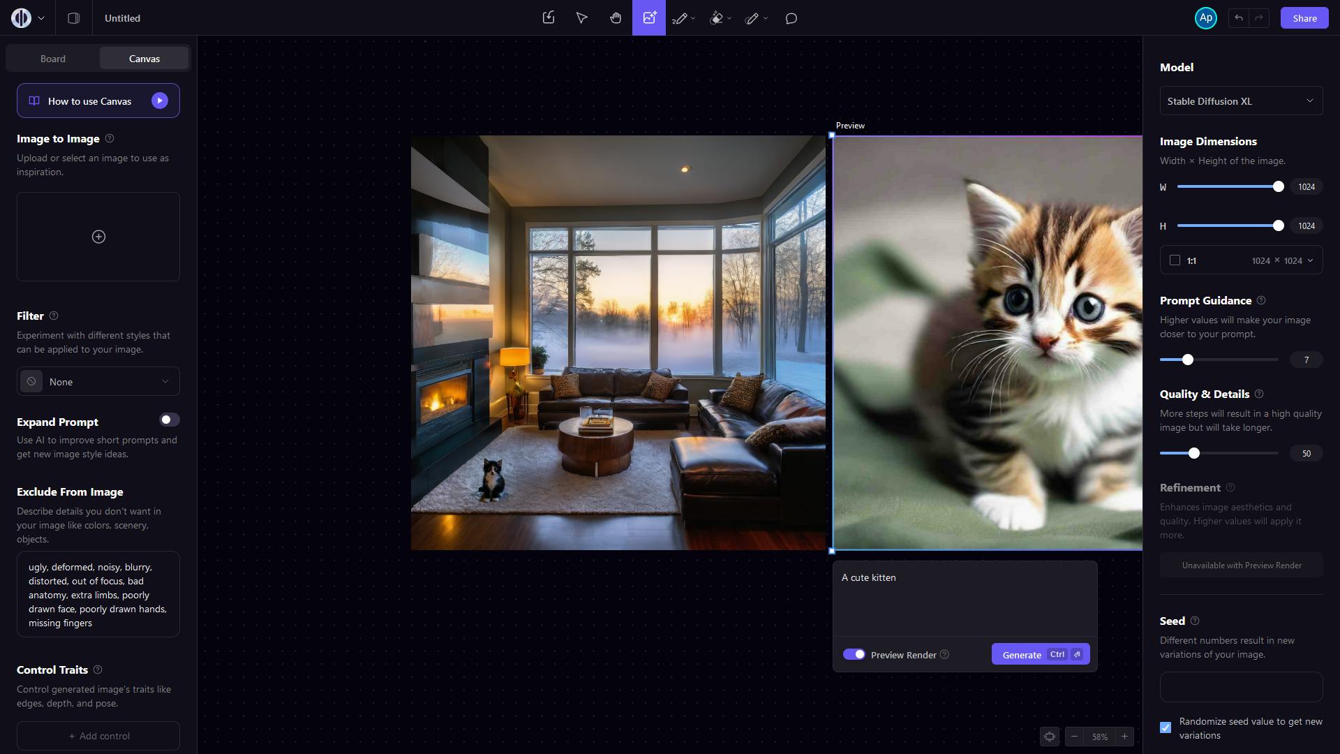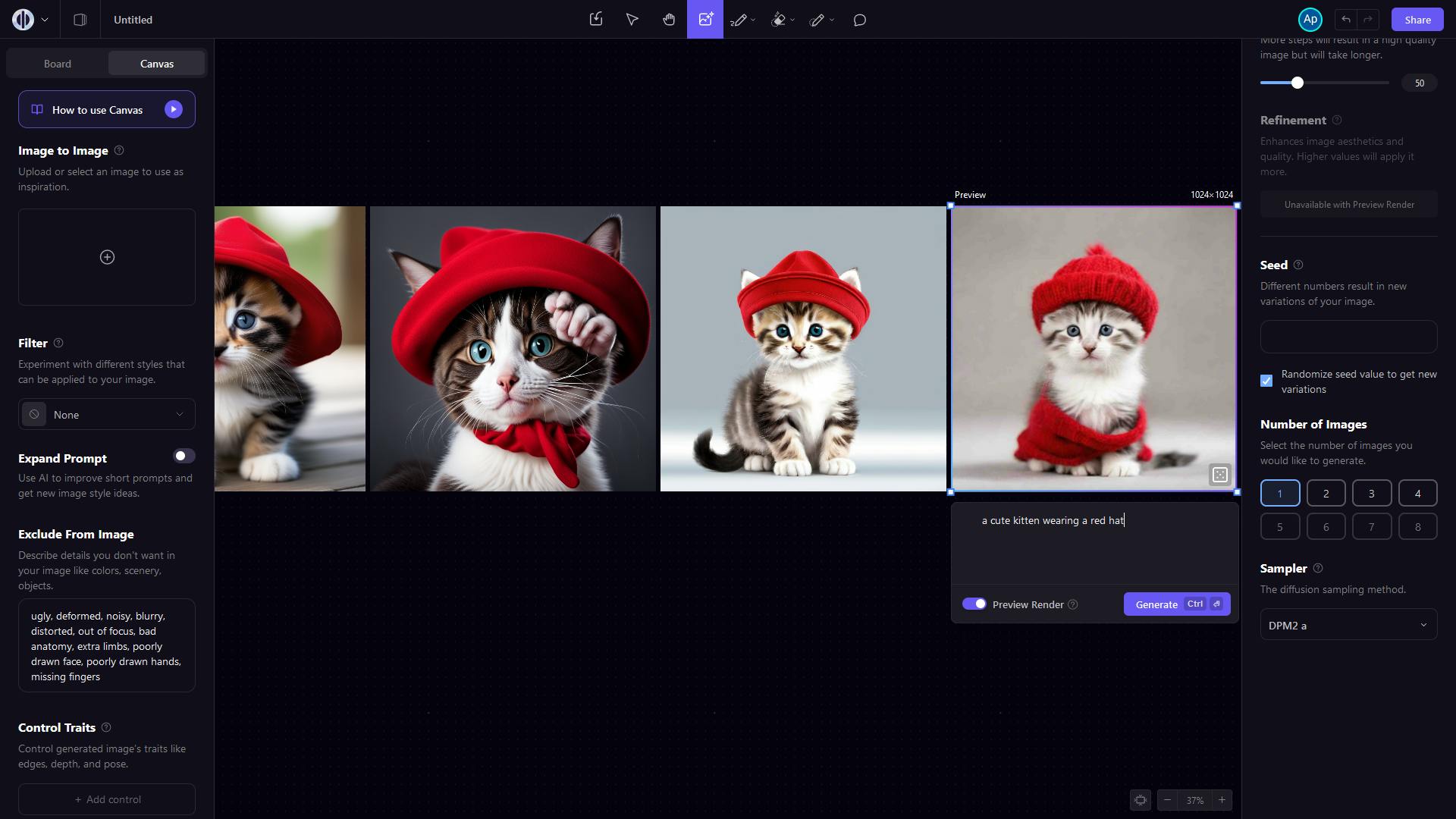 De schuifjes voor Prompt Guidance, Quality & Details en Refinement hebben allemaal invloed op de kwaliteit van de gemaakte afbeeldingen. We komen hier later op terug.