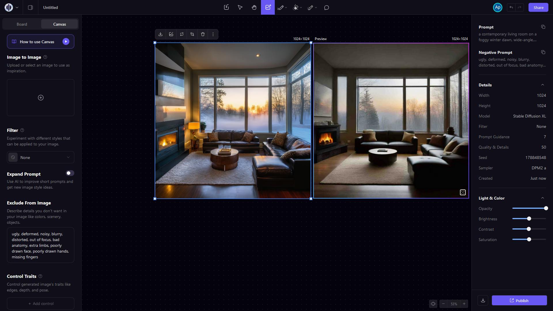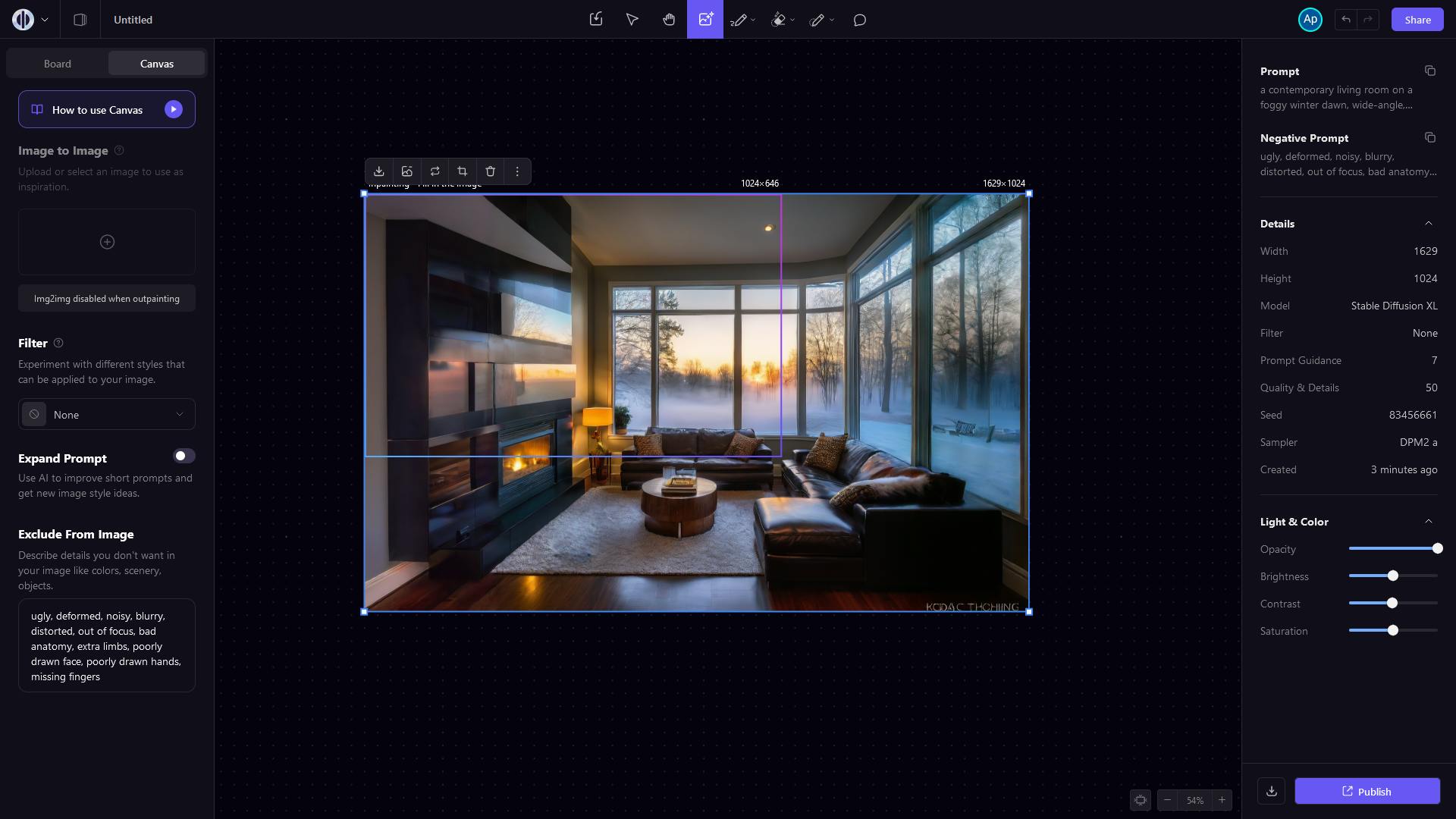 Zet indien nodig Preview weer aan en geef de meer uitgebreide prompt a contemporary living room on a foggy winter dawn, wide-angle, intricate, realistic, highly detailed, 35mm, Kodachrome, vibrant, HDR. Klik op de dobbelsteen totdat het resultaat je bevalt en maak dan het plaatje.