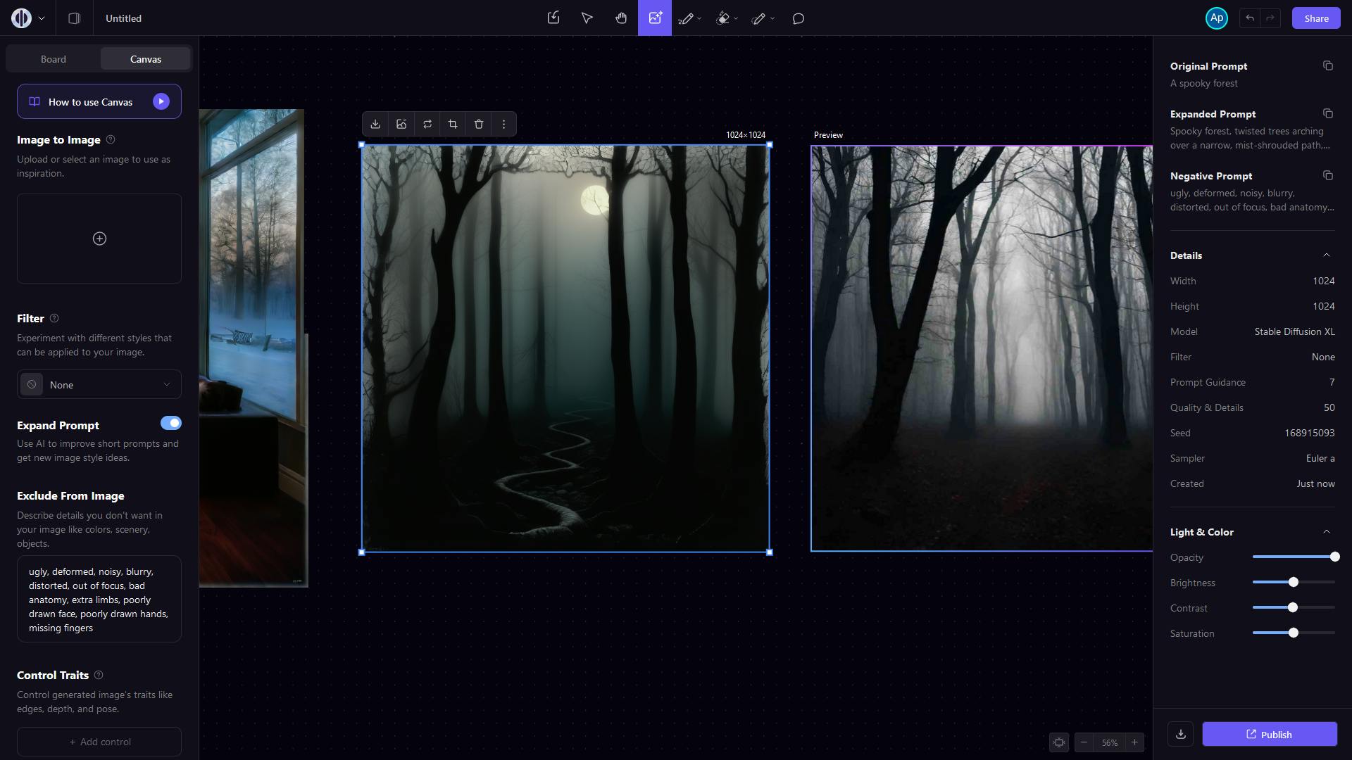 Maak een Preview voor een nieuwe afbeelding met als prompt A spooky forest. Zet links Expand Prompt aan en maak het plaatje. Wanneer het klaar is en je erop klikt, dan zie je rechts de technische details. Als eerste zie je de originele prompt en daaronder de Expanded Prompt, een met behulp van AI opgepepte versie van je oorspronkelijke prompt die mooier beeld moet leveren. In de gratis versie van Playground kun je maximaal 30 prompts per maand laten uitbreiden.