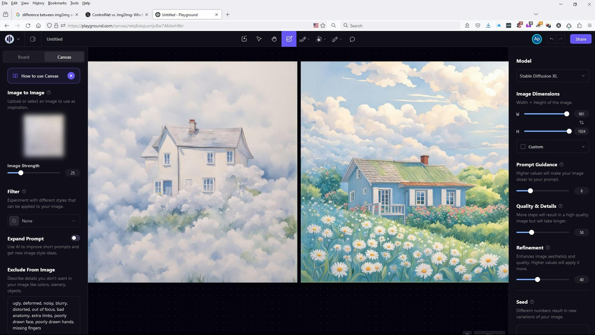 We zetten het schuifje Image Strength op 50 en maken een plaatje met de prompt A house in a green field. Blue sky with white fluffy clouds and sun. Flowers in front of the house. Het witte papier is vooral omgezet in wolken. We doen een tweede poging met het schuifje op 25. Da’s beter. Alles staat op de plek van de schets, zelfs het zonnetje rechtsboven.