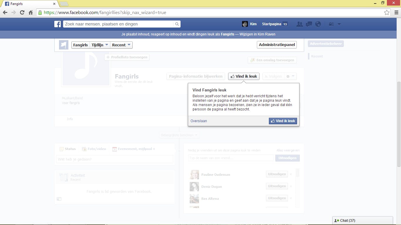 En klaar ben je; je hebt nu een Facebook-Pagina aangemaakt. 'Like' gelijk je pagina en nodig daarna al je vrienden uit om deze ook je net aangemaakte pagina te laten liken. Let wel op de melding bovenin de pagina. Op het moment dat je naar je Pages gaat reageer je automatisch vanaf die pagina in plaats vanaf je eigen account. Dit kun je handmatig bovenin uitzetten.