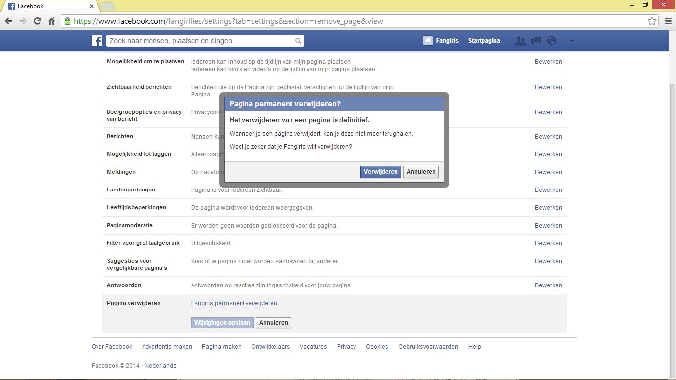 Wil je de pagina niet meer, dan is het gelukkig niet zo moeilijk deze te verwijderen. Op de pagina zelf ga je naar 'pagina bewerken' en dan naar 'instellingen bewerken'. Je komt hier op de instellingenpagina waar je helemaal onderin de pagina kunt verwijderen door op 'permantent verwijderen' te klikken. Alle likes en alle dingen die je op de pagina zet zullen verwijderd worden.