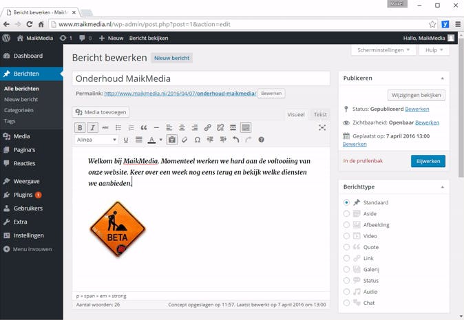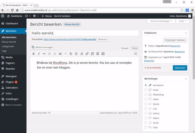 De standaardvormgeving van je WordPress-site oogt nog erg basaal en bestaat uit slechts één webpagina. Verderop in dit artikel passen we dat aan door een ander thema te installeren en nieuwe pagina's toe te voegen. Allereerst voorzie je de website van inhoud, zodat er iets valt te lezen voor je bezoekers. Je kunt bijvoorbeeld aangeven dat er momenteel aan de website gewerkt wordt. Surf naar www.jouwwebsite.nl/wp-login.php, waarbij je 'jouwwebsite' vervangt door je eigen domeinnaam. Log in met je gebruikersnaam en wachtwoord van WordPress. Ga naar Berichten en klik op Hallo wereld om de inhoud van het standaardbericht te openen. Er verschijnt een soort tekstbewerker in beeld waarin je het bericht kunt opmaken. Dit noemt men een WYSIWYG-editor (What You See Is What You Get). Hiermee komt het bericht er aan de 'voorkant' hetzelfde uit te zien.