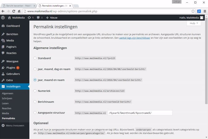Ieder bericht krijgt een eigen webadres. WordPress noemt dit een permalink. Standaard bestaat de url uit een willekeurig nummer of een datum met de titel van het bericht. Tijdens de opmaak van het bericht kun je de structuur van de url handmatig aanpassen, maar handiger is het om de structuur van de permalink in de instellingen vast te leggen, zodat je er geen omkijken meer naar hebt. Ga hiervoor naar Instellingen / Permalinks en bepaal welke elementen je in de url wilt opnemen. Voor veel websites is het gebruikelijk om het jaar, de maand en naam van het bericht in de url te vermelden. Is je website wat statischer, met minder actuele berichten, kies dan voor alleen de berichtnaam. Maak een keuze en klik onderaan op Wijzigingen opslaan.