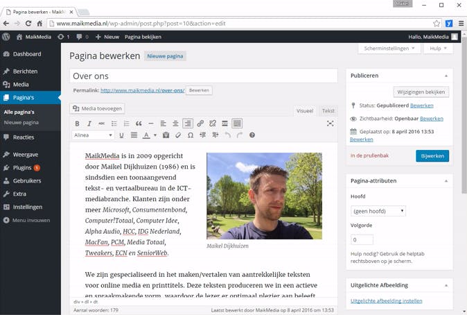 Je weet nu hoe je nieuwe berichten op de hoofdpagina publiceert. Uiteraard wil je de website voorzien van meerdere pagina's. Extra webpagina's zijn met name interessant wanneer je statische informatie wilt laten zien; informatie die weinig actueel is. Veelgebruikte webpagina's zijn hiervoor bijvoorbeeld 'Over ons' of 'Contact'. Klik vanuit het dashboard van WordPress op Pagina's / Nieuwe pagina. Bedenk een paginatitel en voer de tekst in. Vergeet niet om beeld aan de tekst toe te voegen en stel eventueel een uitgelichte afbeelding in. Deze afbeelding verschijnt bij de meeste thema's als vergrote weergave boven aan de pagina. Klik op Publiceren om de pagina definitief toe te voegen.