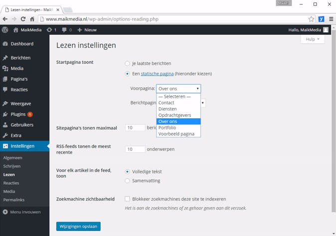 Nieuwe berichten belanden met het standaardthema automatisch op de homepage van je website. Dat is niet altijd de bedoeling. Misschien stel je liever een webpagina met statische informatie als toegangspoort voor je website in. Een meubelmaker die zijn diensten op een persoonlijke website aanbiedt, wil bijvoorbeeld louter reclame voor zichzelf maken. Het periodiek toevoegen van nieuwe berichten zoals bij een nieuwssite, is in deze situatie dus niet van toepassing. Gelukkig biedt WordPress de mogelijkheid om een specifieke webpagina als voorpagina weer te geven. Zorg ervoor dat de beoogde hoofdpagina gereed is (zie tip 4) en navigeer naar Instellingen / Lezen. Bij de optie Startpagina toont kies je voor Een statische pagina. Selecteer achter Voorpagina in het uitrolmenu de titel van de beoogde webpagina. Je klikt onderaan ten slotte op Wijzigingen opslaan.