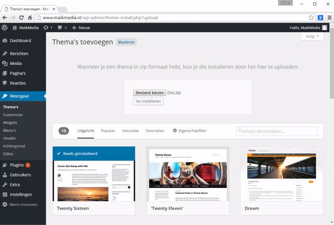 Voor een bedrag van 69 dollar (zo'n 60 euro) heb je toegang tot 87 uitstekende thema's. Heb je een mooi thema gevonden? Je hebt dan als het goed is een zip-bestand naar je pc gedownload. Door dit bestand naar het WordPress-dashboard te uploaden, is het nieuwe thema voor je website beschikbaar. Navigeer hiervoor binnen het cms naar Weergave / Thema's en klik bovenaan op Nieuwe toevoegen. Via Thema uploaden en Bestand kiezen selecteer je het zip-bestand op je harde schijf. Je klikt vervolgens op Openen, waarna je bevestigt met Nu installeren. Kies als laatste voor Activeren en bekijk het resultaat op je website. Schrik niet als je website er ietwat rommelig uitziet, want je moet het thema nog vormgeven.