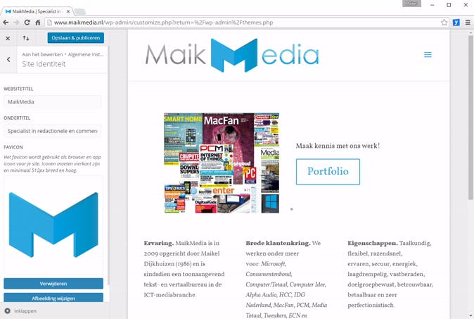 Nadat je het thema hebt geïnstalleerd, ga je de website wat meer opsmuk geven. Je regelt dat door alle thema-instellingen nauwkeurig door te nemen en de beschikbare opties te wijzigen. Voeg bijvoorbeeld afbeeldingen, kleuren en een ander lettertype toe. Welke instellingen er exact beschikbaar zijn, is afhankelijk van het gekozen thema. Veel thema's bieden de mogelijkheid om via de functie Customizer aanpassingen te maken. Mits beschikbaar, navigeer je daarvoor vanuit het dashboard naar Weergave / Customizer. Je ziet de huidige lay-out van je website verschijnen, waarbij je het deelvenster aan de linkerkant gebruikt om de instellingen te wijzigen. Het resultaat is direct zichtbaar! Zodra je iets wijzigt, bevestig je bovenaan met Opslaan & publiceren. Veel thema's integreren binnen het dashboard van WordPress overigens ook een eigen menu waarin je het uiterlijk van je website onder handen kunt nemen.