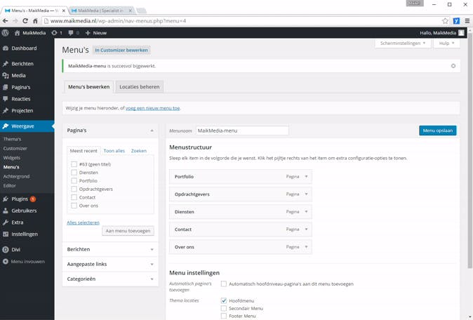 Afhankelijk van welk thema je hebt gekozen, zijn er één, twee of misschien wel drie plekken beschikbaar voor het menu. Voor de navigatiestructuur op je website is het belangrijk dat je de menu's logisch indeelt. Je gebruikt hiervoor categorieën van berichten en pagina's die je in eerder in dit artikel hebt aangemaakt. Ga vanuit het dashboard naar Weergave / Menu's en bedenk een geschikte menunaam. Nadat je hebt bevestigd met Menu aanmaken, zet je aan de linkerkant een vinkje voor alle pagina's die je in het menu wilt hebben. Klik vervolgens op Aan menu toevoegen. Geef ook aan of je berichten, aangepaste links en/of categorieën aan het menu wilt toevoegen. Wijzig bij het onderdeel Menustructuur de volgorde door de menublokken te verslepen. Je geeft bij Thema locaties aan op welke plek je het zojuist aangemaakte menu wilt weergeven. Bevestig als laatste met Menu opslaan.