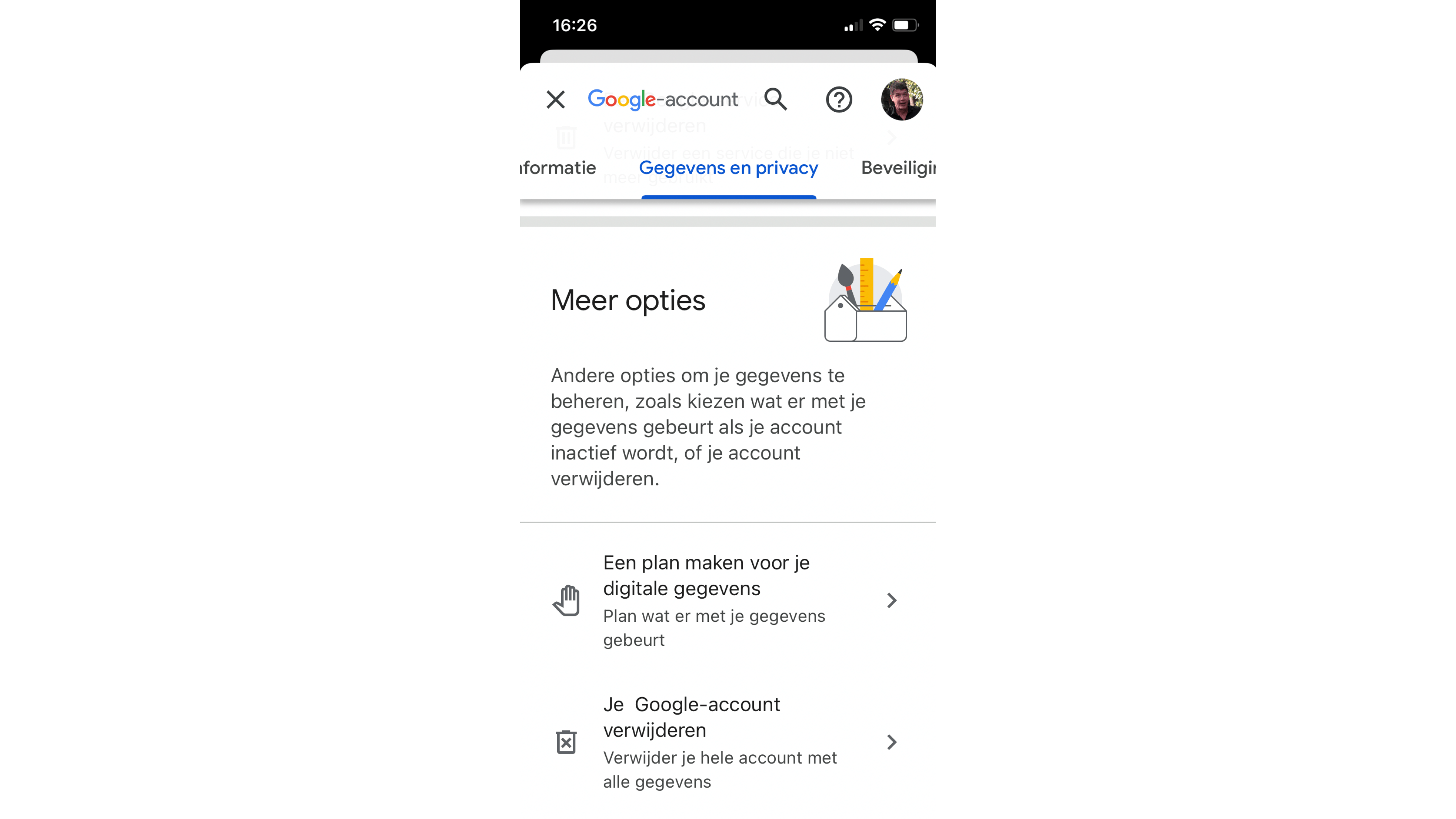 Ook via je smartphone kun je je Google- of Gmail-account verwijderen. Open daarvoor de Gmail-app, tik op je profielfoto en kies Je Google-account beheren. In het volgende scherm zie je bovenaan verschillende tabbladen. Kies het tabblad Gegevens en privacy. Scrol helemaal naar beneden en tik op Je Google-account verwijderen. Vervolgens typ je je wachtwoord en lees je de informatie. Als je nog steeds wilt doorgaan, vink dan onderaan de twee vakjes aan en tik op de knop Account verwijderen.