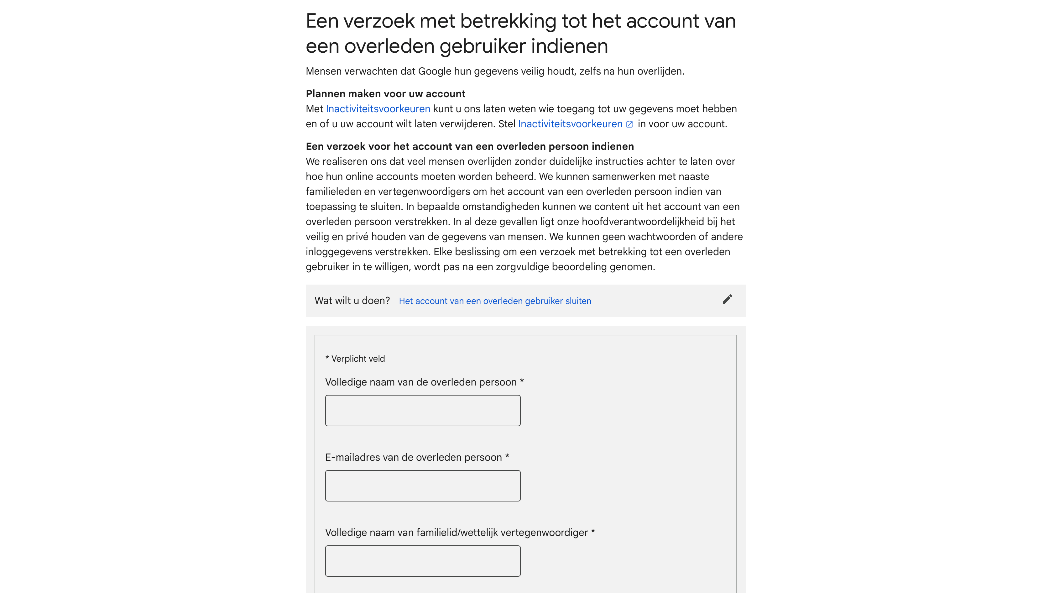 Voor het afsluiten en verwijderen van een account heeft Google een eigen procedure. Via die pagina kun je een verzoek indienen om het account van de overleden gebruiker te beëindigen. In deze procedure moet je je eigen gegevens en je relatie met de overledene invullen en een scan van de overlijdensakte en je eigen identiteitsbewijs uploaden.