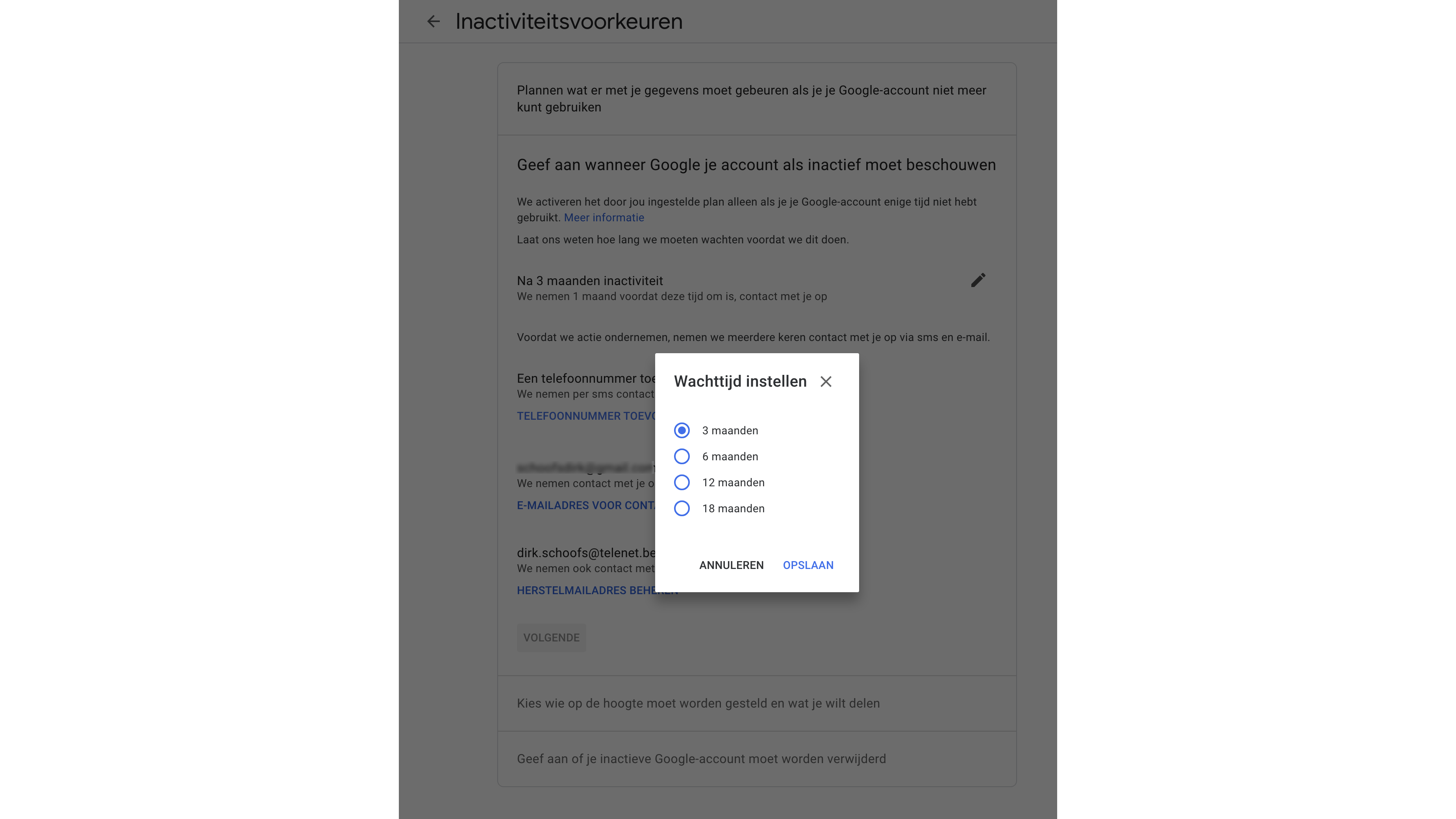 Op myaccount.google.com/inactive bepaal je na hoeveel tijd Google een dierbare mag inlichten over jouw langdurige inactiviteit op Google. Ook geef je aan welke gegevens er in dat geval aan die persoon mogen worden vrijgegeven. Met die informatie kan die persoon eventueel zelfs je account afsluiten.