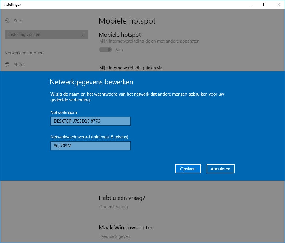 Je kunt ervoor kiezen om de automatisch gegenereerde gegevens te laten staan, maar je kunt deze ook aanpassen door op de knop Bewerken te drukken. Je kunt het wachtwoord en de naam van de wifi-hotspot aanpassen. Windows 10 controleert hier niet hoe veilig het wachtwoord is, en je kunt – maar we raden je dat natuurlijk niet aan – bijvoorbeld het wachtwoord hetzelfde laten zijn als de naam van je hotspot.