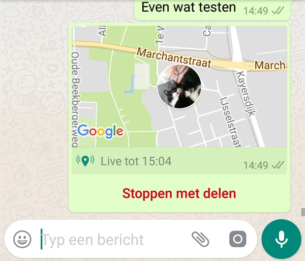 Je zult merken dat je icoontje op de Google maps-kaart meebeweegt met je daadwerkelijke positie. Druk op Stoppen met delen als je je privacy weer terug wilt. Overigens is het goed te weten dat deze informatie - net zoals al het andere wat je in WhatsApp deelt - versleuteld wordt door middel van end-to-end-encryptie. Wees dus niet bang dat WhatsApp stiekem mee zit te kijken.