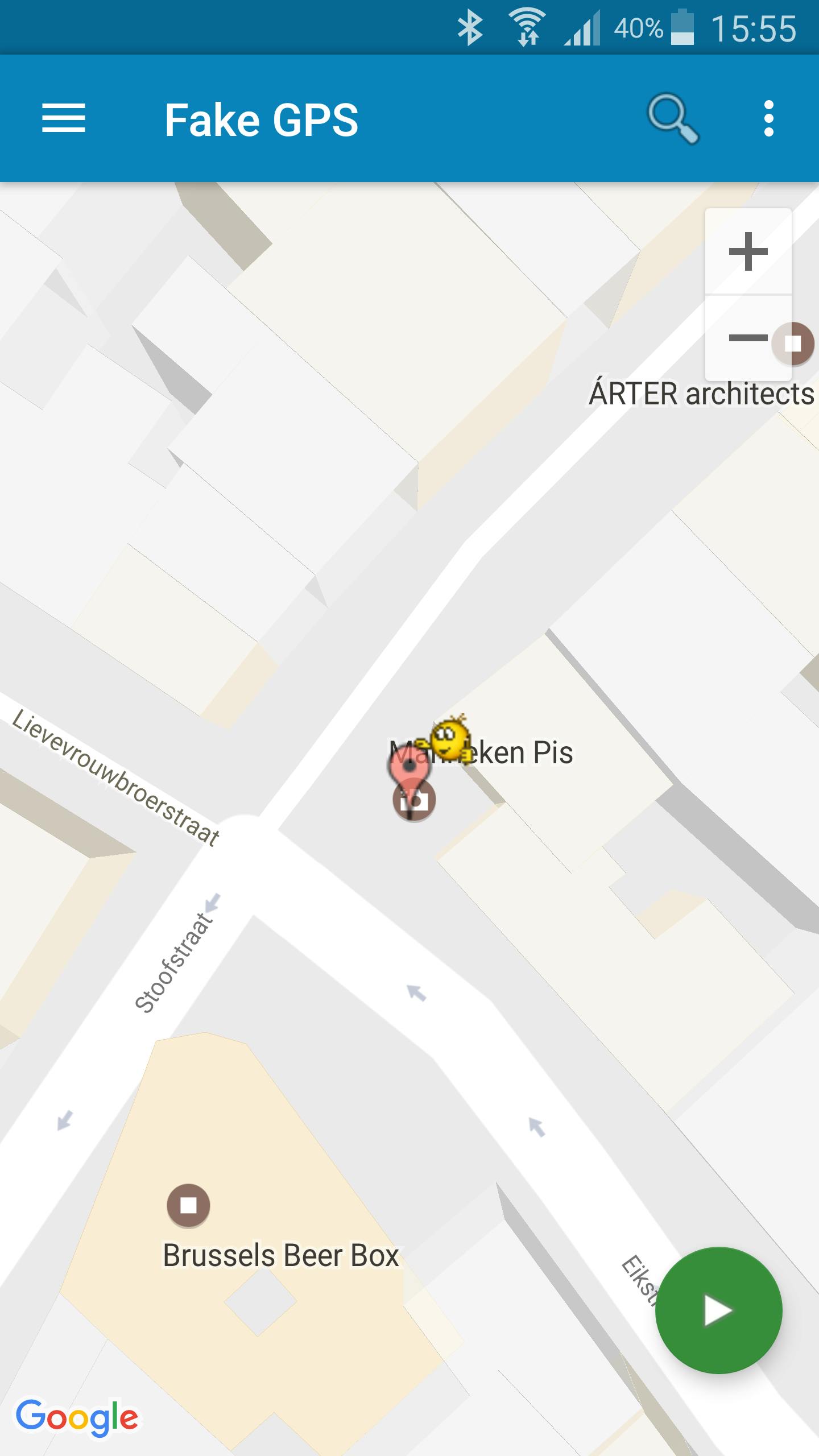 Het instellen van een neplocatie is bij Fake GPS heel eenvoudig. Verplaatst het locatiepinnetje op de kaart naar de gewenste locatie. Gebruik de zoomfunctie om dit in meer detail te doen. Je kunt ook een locatie opzoeken via de zoekfunctie. Wij zochten Brussel en zetten het pinnetje bij Manneken Pis. Druk daarna op de speeltoets. Start Google Maps om te zien of de ingestelde locatie klopt. Om de locatie te wijzigen zul je opnieuw naar de Fake GPS-app moeten. Een leuk alternatief is Mock GPS waarmee je via een joystick op het scherm kunt rondwandelen. De snelheid kun je vooraf instellen.