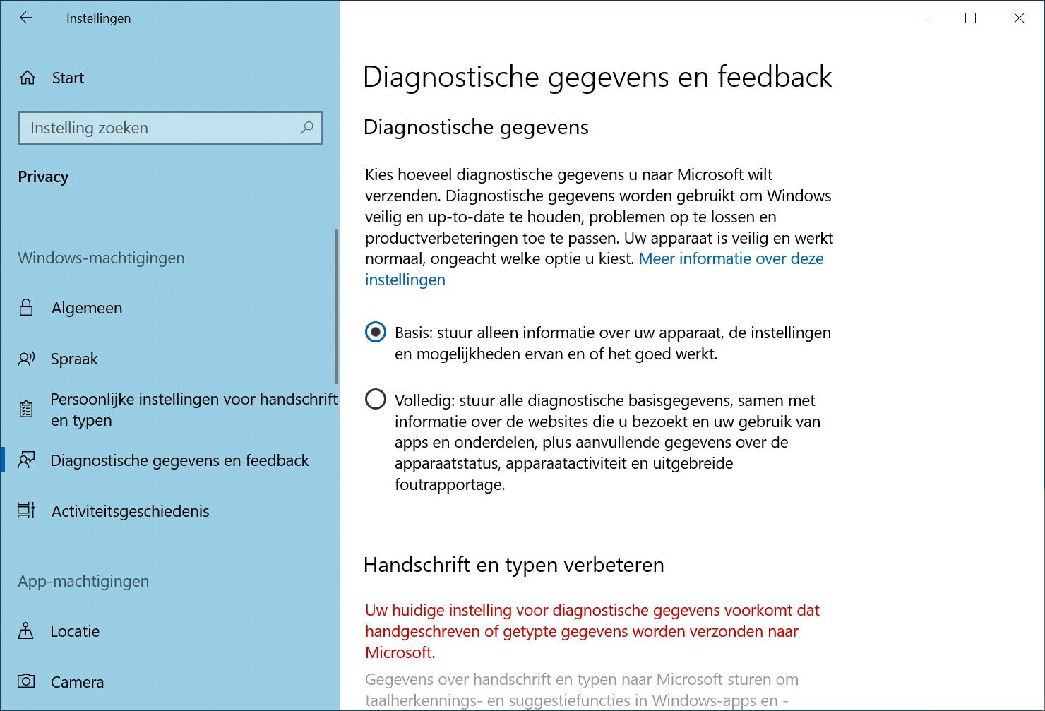 De afgelopen jaren heeft Microsoft flink gesleuteld aan de privacyopties in Windows 10. En eerlijk is eerlijk: op het gebied van instelmogelijkheden en duidelijkheid hebben de makers een flinke verbetering doorgevoerd. Controleer of de privacyopties zo min mogelijk persoonlijke gegevens delen. Je vindt de privacyopties in het instellingenvenster van Windows (Windows-toets+I). Kies voor Privacy. We beginnen in de sectie Algemeen. In dit venster vind je vier opties, waarvan de kans groot is dat sommige zijn ingesteld op Aan. Hier brengen we verandering in. Zet elke optie op Uit. De secties onder Algemeen open je ook. Bij Spraak zet je de schuif ook op Uit, net als bij Persoonlijke instellingen voor handschrift en typen. In het onderdeel Diagnostische gegevens en feedback wordt bepaald hoeveel gegevens over jouw computergebruik worden gedeeld met Microsoft. Deze gegevens worden gebruikt door Microsoft om eventuele fouten op te sporen en daarmee Windows te verbeteren. Deel je liever niet te veel gegevens (zoals de informatie over bezochte websites en het gebruik van apps), dan kies je in dit onderdeel voor Basis. In deze modus wordt alleen basisinformatie over de computer gedeeld. In de twee onderdelen eronder (Handschrift en typen verbeteren en Ervaringen op maat) zorg je ervoor dat de schuif ook staat op Uit.