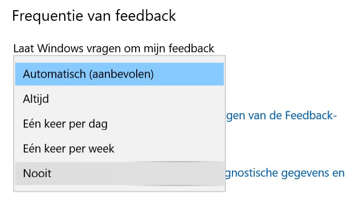 Soms vraagt Windows je uit het niets naar je ervaring, bijvoorbeeld met een onderdeel van het besturingssysteem. Standaard is deze ‘optie’ ingeschakeld als automatisch. Heb je hieraan geen behoefte, verbied Windows dan om naar feedback te vragen. In het instellingenvenster Privacy kies je voor Diagnostische gegevens en feedback. In de sectie Frequentie van feedback kies je in het menu voor Nooit. Je wordt hierna niet meer lastiggevallen.