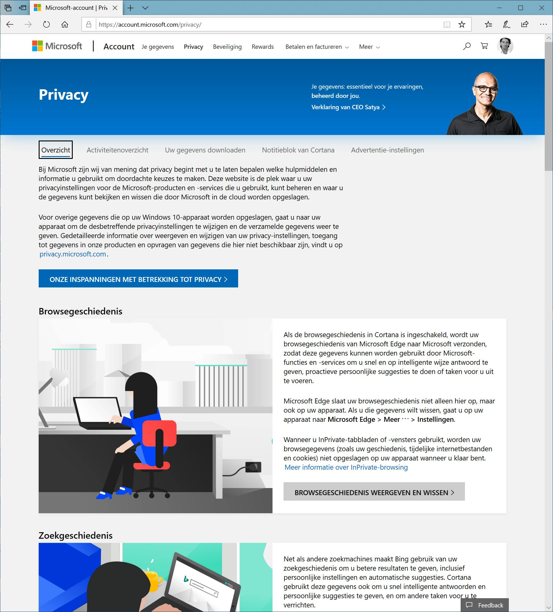Best belangrijk, maar helaas weinig bekend: het privacydashboard van Microsoft, waarin je ziet welke gegevens van je worden verzameld binnen je Microsoft-account. Voor ons doel belangrijk om hier een kritische blik op te werpen. Je vindt het dashboard op de site van Microsoft. Het bestaat uit vijf tabbladen. Op de tab Overzicht zie je die verschillende activiteiten en welke gegevens hier worden verzameld. Zo is er bijvoorbeeld het onderdeel Zoekgeschiedenis, waarin je kunt zien op welke items je hebt gezocht. Of Locatieoverzicht, waarin wordt bijgehouden waar je je hebt begeven. Al deze gegevens kun je wissen. Als je het overzicht hebt geopend, kies je voor Activiteit wissen. Deze optie vind je in de rechterbovenhoek van het venster. Om in één keer alle overzichten van activiteiten te zien, klik je op Activiteitenoverzicht. Net als bij andere online diensten, zoals Facebook, heb je bovendien de mogelijkheid om een kopie van alle gegevens te downloaden, die je lokaal kunt opslaan. Kies dan voor Uw gegevens downloaden en klik op Nieuw archief maken.