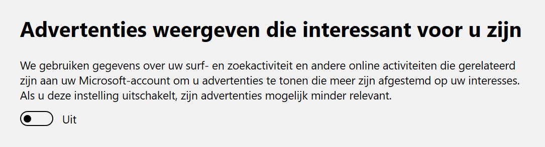 In het privacydashboard vinden we nog een ander belangrijk onderdeel: Advertentie-instellingen. Op basis van je computergebruik kunnen adverteerders persoonlijke aanbiedingen doen. Niet iedereen is hiervan gediend. Via deze pagina kun je daar een einde aan maken. Klik op Advertentie-instellingen. In de sectie Aangepaste advertenties weergeven in uw browser zet je de schuif op Uit. Ook de optie Advertenties weergeven die interessant voor u zijn schakelen we uit. Hiermee voorkom je dat gegevens over je zoek- en surfactiviteiten worden gebruikt voor het tonen van advertenties.