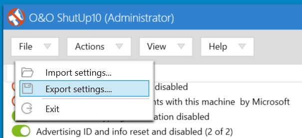 Gebruik je meerdere computers waarop je O&O ShutUp10 wilt uitvoeren? Je kunt gemaakte instellingen exporteren en ze vervolgens importeren op een andere computer. Dit bespaart kostbare tijd en je zorgt ervoor dat de instellingen op alle computers gelijk zijn. In het hoofdvenster van O&O ShutUp10 kies je voor File / Export settings. Geef een geschikte bestandsnaam op en klik op Opslaan. Het resulterende bestand kun je vervolgens op de andere computer importeren. Kies op die computer in O&O ShutUp10 voor File / Import settings en wijs het eerder gemaakte bestand aan. De instellingen worden overgenomen.
