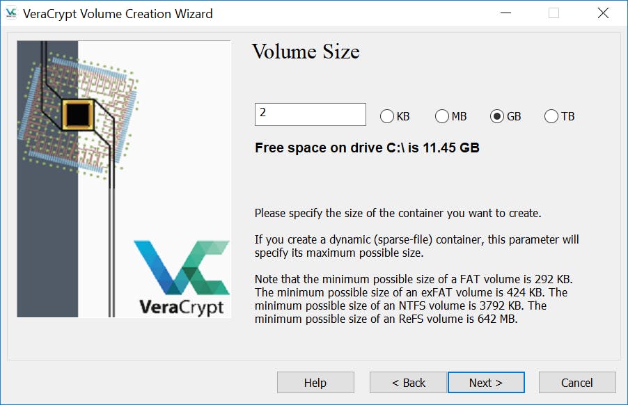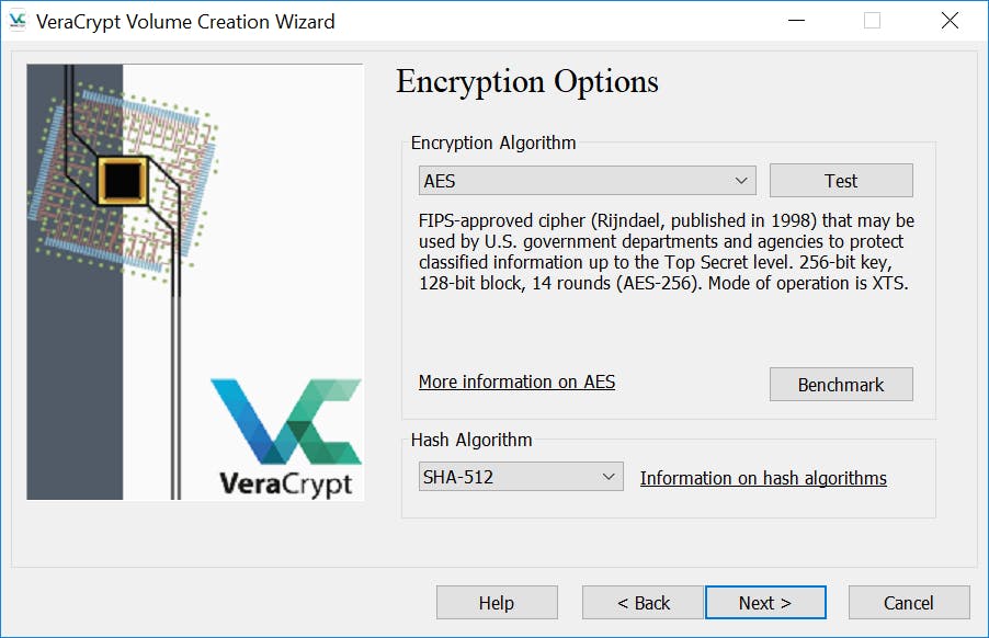 VeraCrypt biedt de mogelijkheid om de versleutelde volumes te verbergen. Ze zijn dan niet zichtbaar in bijvoorbeeld Windows Verkenner. Wij kiezen voor Standard VeraCrypt volume. Klik op Next en geef aan op welke locatie het versleutelde volume moet worden opgeslagen. Dat kan op de vaste schijf zijn of op een externe medium zoals een usb-stick. Klik op Next. Voor de versleuteling van bestanden ondersteunt VeraCrypt meerdere algoritmen. Je krijgt dan ook de keuze van welk algoritme je gebruikt wilt maken. Het veranderen van het standaardalgoritme is niet nodig voor de gemiddelde gebruiker: wij kiezen dan ook voor de geselecteerde versleuteling. Klik op Next. Hierna geef je aan hoe groot het versleutelde volume mag zijn, bijvoorbeeld 2 GB of 1 TB. Zorg ervoor dat je een omvang kiest die ook beschikbaar is op de schijf waarop je de versleutelde bestanden onderbrengt. Klik op Next om te bevestigen.