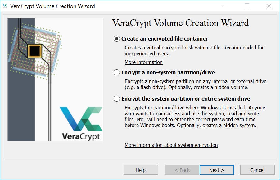 Alles in orde? Dan is het tijd om verder te gaan met VeraCrypt. Eerst maken we een nieuw volume aan. Klik op de knop Create Volume. Een wizard loodst je door de stappen. Bepaal welk deel je wilt afschermen. Wil je een specifiek gedeelte afschermen, dan kies je Create an encrypted file container. Naar deze optie gaat onze voorkeur uit: je zorgt hiermee voor een veilige omgeving, maar houdt de flexibiliteit van snelle toegang tot onderdelen die je niet per se hoeft te versleutelen. Wil je een volledige partitie of de hele schijf versleutelen, dan kies je voor Encrypt a non-system partition/drive. Wil je ook dat Windows zelf wordt versleuteld, dan is er de optie Encrypt the system partition or entire system drive. Dit betekent uiteraard wel dat er om een wachtwoord wordt gevraagd zodra je de computer opstart, voordat Windows wordt geladen. Bevestig je keuze met een klik op Next.