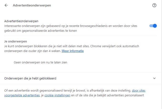 Hier vind je schakelaar voor de advertentieonderwerpen: zet deze schakelaar op Uit. Hiermee voorkom je dat Chrome je surfgedrag analyseert, op basis daarvan topics aan je toekent en vervolgens die topics deelt met adverteerders.