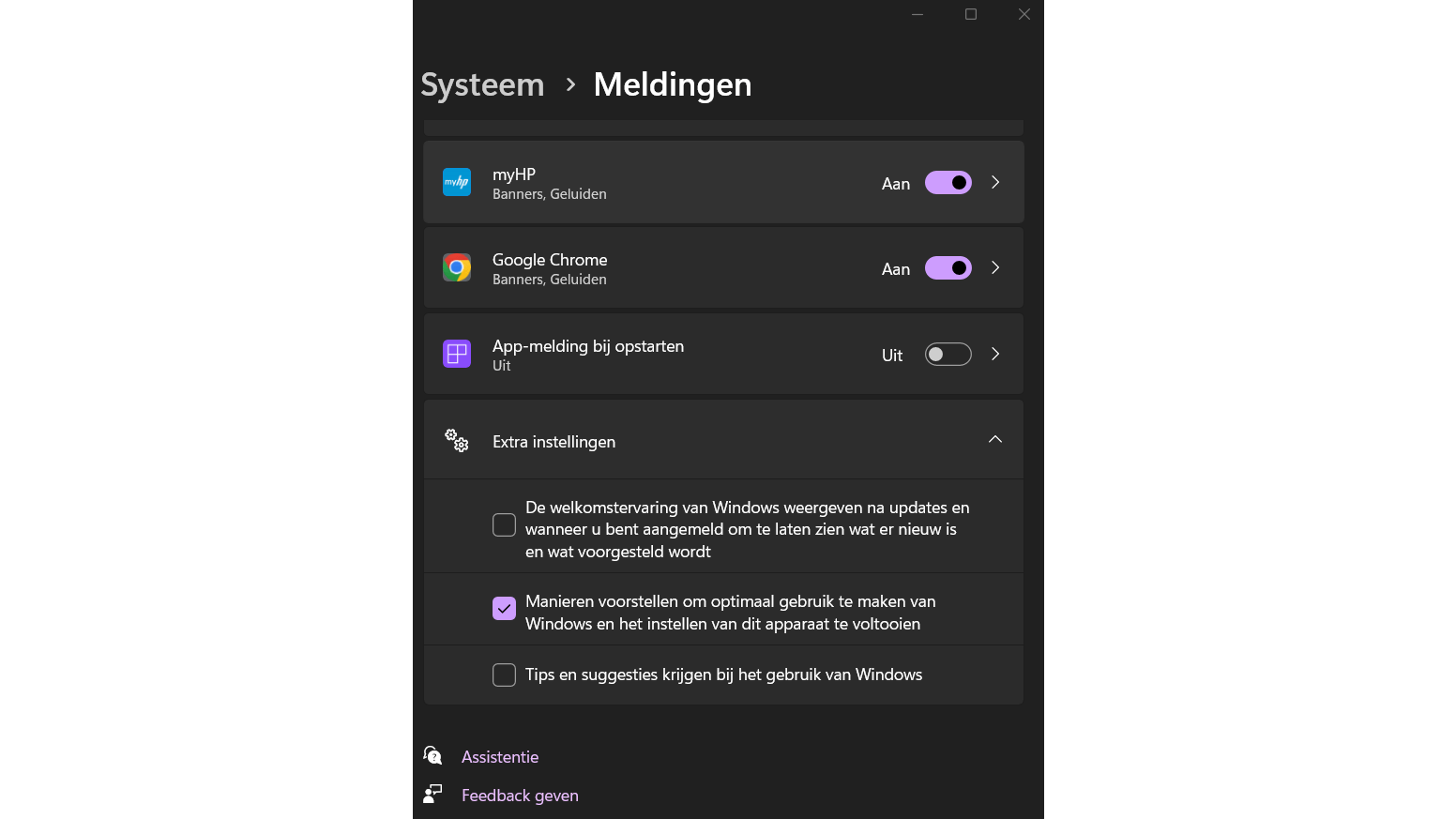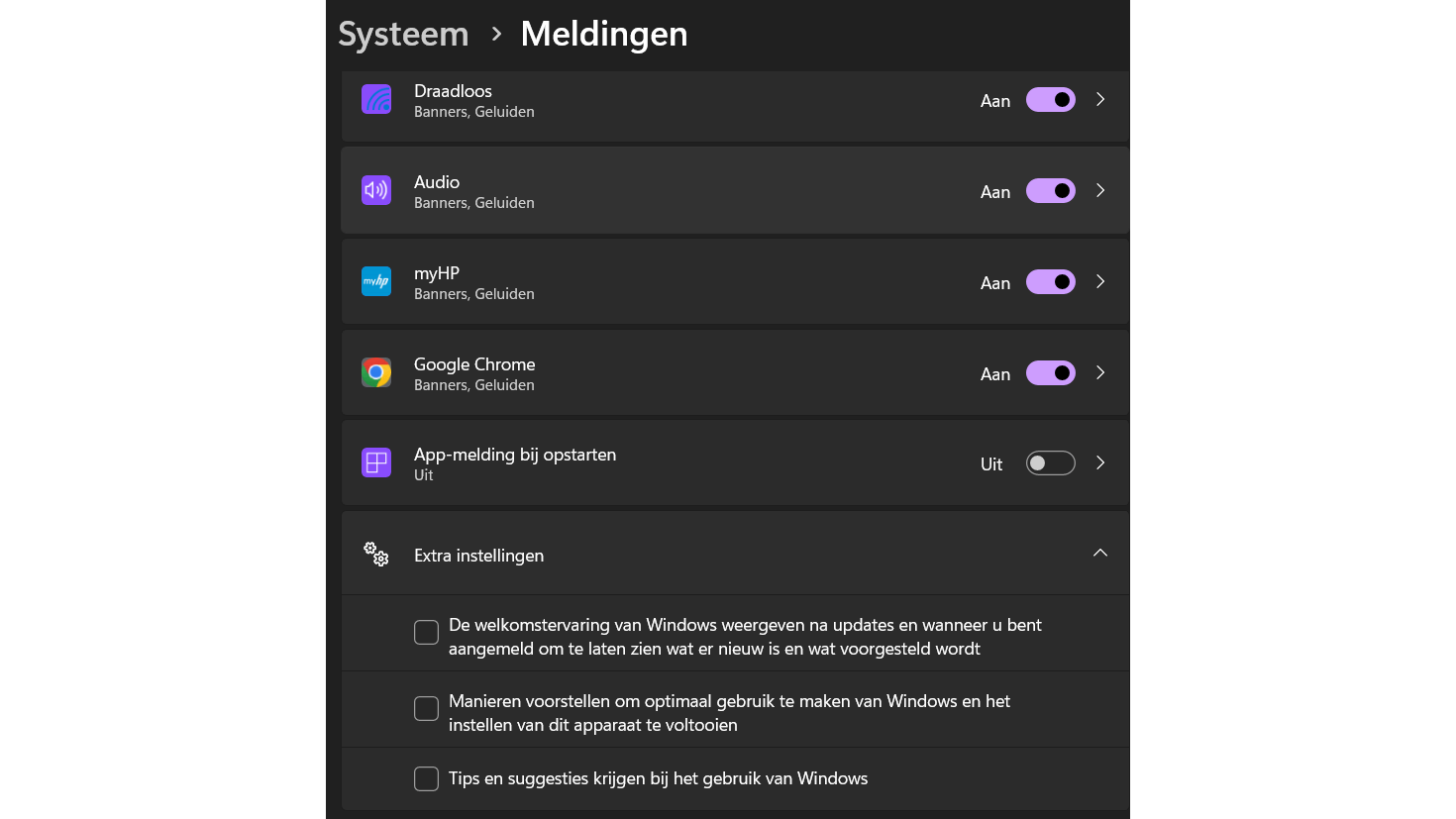 Het besturingssysteem en apps zullen ook kleine reclameboodschappen tonen in de vorm van toast-meldingen. Een toast-melding is een pop-up met veelal een stukje informatie of feedback over een recente actie. Om ook dit aantal meldingen te verminderen, ga je naar Instellingen / Systeem / Meldingen. Vervolgens scrol je helemaal naar beneden en open je Extra instellingen. Schakel al die opties uit: