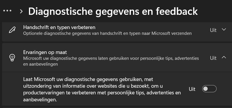 Klik nu in de linkerkolom opnieuw op Privacy en beveiliging en open Diagnostische gegevens en feedback. Ga naar Ervaringen op maat en verwijder het vinkje bij Laat Microsoft uw diagnostische gegevens gebruiken, met uitzondering van informatie over websites die u bezoekt, om u productervaringen te verbeteren met persoonlijke tips, advertenties en aanbevelingen. Ook deze functie is een manier van Microsoft om je ongevraagd met tips en aanbevelingen te bestoken.