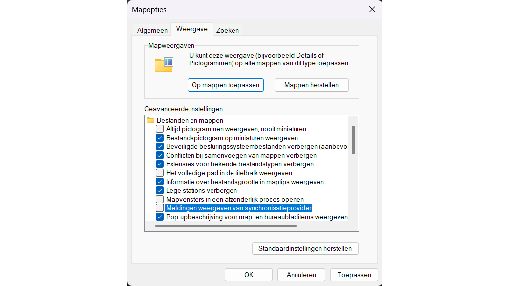 Windows Verkenner is gelukkig bijna advertentievrij, ware het niet dat de OneDrive-banner je af en toe probeert te verleiden een back-up naar de cloud te maken. Je hebt een Microsoft 365-abonnement nodig als je daar meer dan 5 GB aan gegevens wilt opslaan. Ook deze meldingen kun je uitschakelen. Open Windows Verkenner en klik rechtsboven op het menu met de drie stippen. Vervolgens selecteer je Opties. In het nieuwe venster ga je naar het tabblad Weergave, waar je de functie Meldingen weergeven van synchronisatieprovider uitschakelt. Klik op Toepassen om de wijzigingen op te slaan. Hierdoor zal de Verkenner stoppen met het promoten van OneDrive.