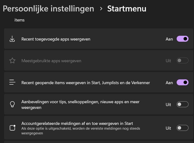 Sinds de Windows 11-update van mei 2024 (KB5036980) toont het startmenu ook apps uit de Microsoft Store die daar in het gedeelte Aanbevolen verschijnen. Als je niet wilt dat het startmenu je deze aanbevolen apps door de strot probeert te duwen, ga je naar Instellingen / Persoonlijke instellingen / Startmenu. Zet daar de schakelaar uit bij Aanbevelingen voor tips, snelkoppelingen, nieuwe apps en meer weergeven.
