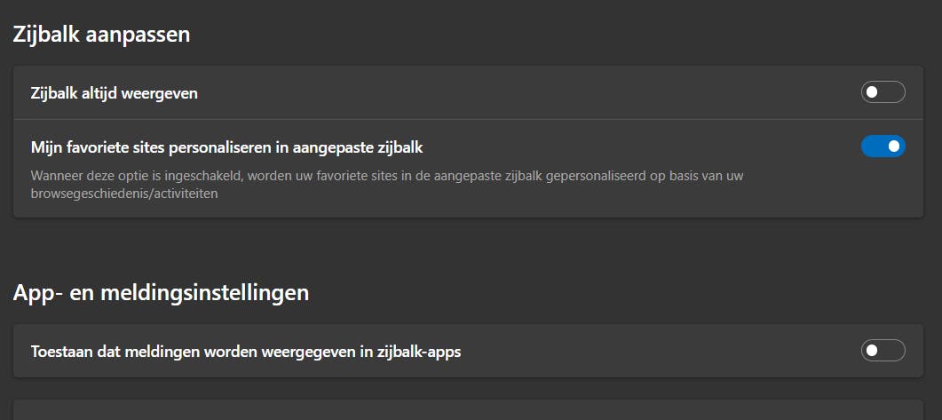 Nogal wat gebruikers klagen over het feit dat Microsoft Edge er erg druk uitziet en ook hier kun je veel functies beschouwen als advertenties. Open Edge en klik op de knop met de drie stippen rechtsboven. Daarna open je de Instellingen. Klik op Sidebar. Aan de rechterkant bij Zijbalk aanpassen zet je de schakelaar bij Zijbalk altijd weergeven uit. We raden aan om iets verder naar beneden nog een andere optie uit te zetten: Toestaan dat meldingen worden weergegeven in zijbalk-apps.