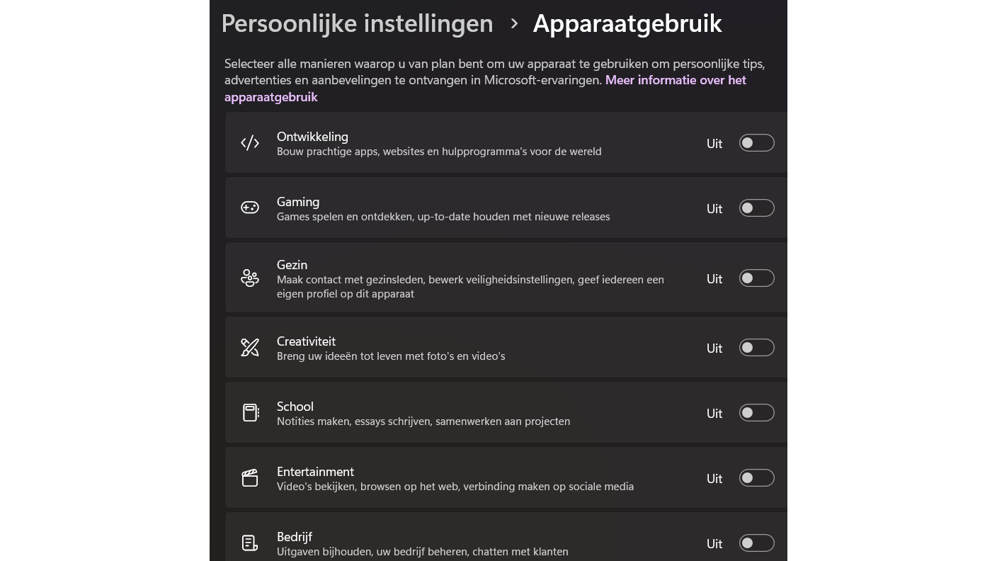 We gaan nog even door met de snoeioperatie in de Persoonlijke instellingen. Scrol in dit venster naar beneden tot je bij Apparaatgebruik bent. Hier wordt gevraagd voor welke doeleinden je de laptop of desktop gebruikt. Op basis van die keuze zal Microsoft persoonlijke tips, advertenties en aanbevelingen sturen. Als je vindt dat Microsoft hier niets mee te maken heeft, schakel je alle opties uit. Zo schrap je weer een hoop reclame. Het systeem zal de advertenties nu niet langer kunnen personaliseren op basis van je activiteiten. Dit geldt voor apps, Microsoft-diensten en advertenties voor de desktopervaring, maar uiteraard niet voor advertenties die je op websites ziet.