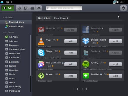 Jolicloud voegt aan dit alles een ‘sociale’ component toe. Iedere gebruiker heeft een profiel, en u kunt de profielen van andere gebruikers bekijken en zien welke toepassingen ze aanbevelen. U kunt commentaar geven op programma’s en in het App Center krijgt u te zien hoe populair elk programma is. Featured Apps en Friends’ Picks maken dankbaar gebruik van de aanbevelingen van andere gebruikers. Dankzij uw profiel worden de geïnstalleerde toepassingen bovendien gesynchroniseerd met elke andere Jolicloud-installatie waar u hetzelfde profiel gebruikt. Zo zorgt u er heel eenvoudig voor dat u op twee netbooks altijd dezelfde programma’s geïnstalleerd hebt.