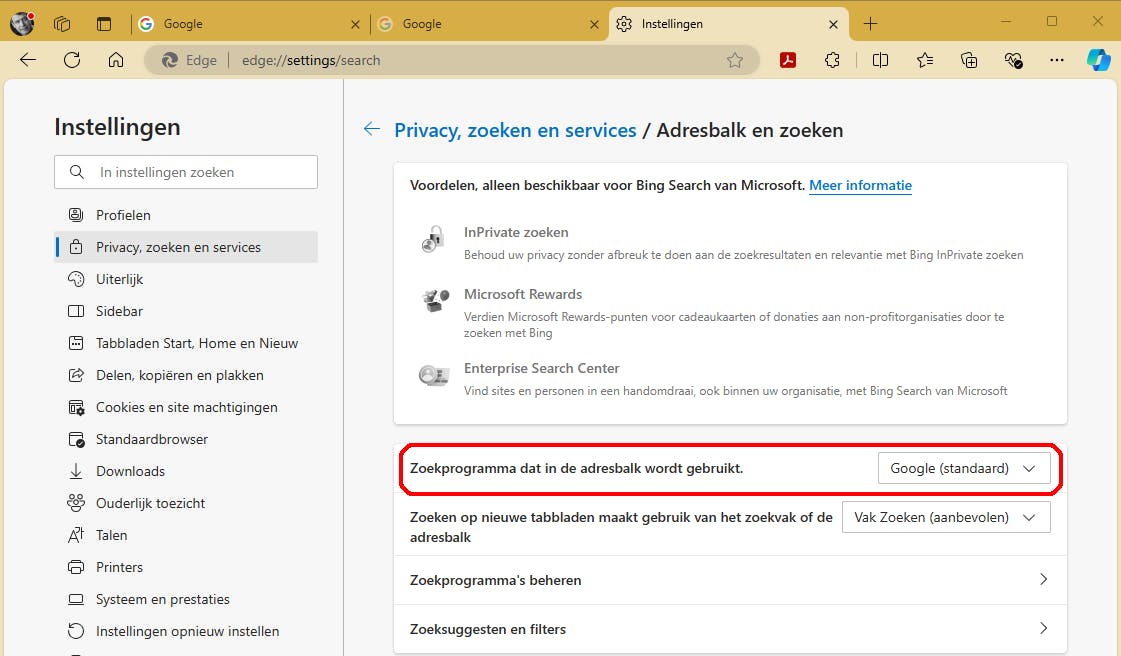 Eerst passen we de ingestelde zoekmachine aan. Klik op de drie puntjes in de rechterbovenhoek om het menu te openen en kies Instellingen. Vervolgens selecteer je in de linkerbalk de rubriek Privacy, zoeken en services. Scrol helemaal naar beneden tot je bij Adresbalk en zoeken komt. Bij Zoekprogramma dat in de adresbalk wordt gebruikt zul je zien dat standaard Bing is ingesteld. Verander dit in de zoekmachine waar je de voorkeur aan geeft, bijvoorbeeld https://www.google.nl.