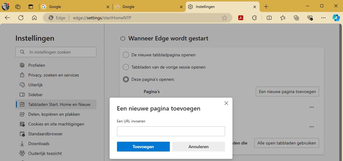 Nu je in de instellingen bent, kun je ook zorgen dat Edge niet langer met MSN opstart. In het instellingenmenu klik je op de rubriek Tabbladen Start, Home en Nieuw. Deze pagina begint met de vraag wat je wilt zien als Edge opstart. Klik op Een nieuwe pagina toevoegen en druk op Enter. Daarna ga je naar het onderdeel Home-knop en daar doe je hetzelfde. Vanaf nu toont Edge de zelfgekozen webpagina, zowel bij het opstarten van de browser als wanneer je op de Home-knop klikt. Ieder nieuw tabblad zal nog wel de MSN-pagina presenteren, tenzij je nog een stap verdergaat.