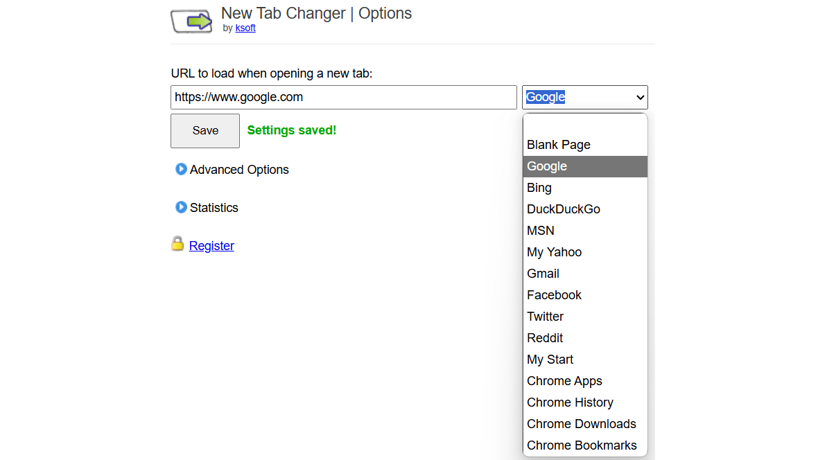 Wil je op geen enkel nieuw tabblad meer de MSN-pagina te zien krijgen, dan moet je een extensie installeren, zoals New Tab Changer. Klik op de knop Downloaden en bevestig daarna dat je de extensie wilt toevoegen. Je ontvangt een bericht dat je de extensie kunt inschakelen. Doe dat. Eenmaal geïnstalleerd, klik je in de knoppenbalk bovenaan op het pictogram van het puzzelstukje. Dat is de knop Extensies. Open New Tab Changer. Je kunt ervoor kiezen om telkens met een nieuw leeg tabblad te beginnen of je kunt een vooraf ingestelde service selecteren, zoals Google, Gmail, Facebook of Chrome Bookmarks. Bewaar je keuze door op Save te klikken. Deze functies horen bij de gratis basisversie van New Tab Changer. Voor de geavanceerde versie die ook de statistieken bijhoudt, moet je betalen.