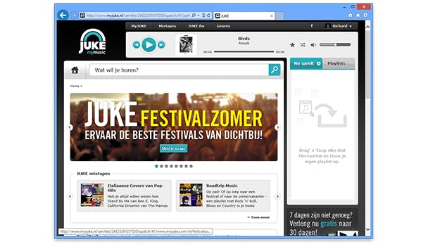 [Juke](http://www.myjuke.com/) ------------------------------ **Prijs** Vanaf € 9,67 euro per maand **Taal** Nederlands **OS** Universeel via website; plus apps voor Windows 8, Android, iOS **Pluspunten** Apps zijn overzichtelijk Grote muziekbibliotheek **Minpunten** Offline gebruik alleen mogelijk met mobiele apps Abonnementskosten **SCORE 7/10**