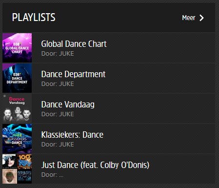 Wat afspeellijsten betreft heeft het genre Dance wel genoeg te bieden, maar weer vooral in het populaire segment. Een afspeellijst met hardcore of hardstyle is er niet, terwijl laatstgenoemde toch echt wel typisch Nederlands is. We snappen dat Apple Music geen Defqon 1-afspeellijst heeft, maar dan zou Juke die als typische Nederlandse streamingdienst toch juist moeten hebben?