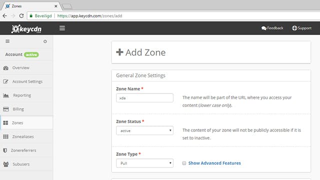 Na het inloggen bij KeyCDN begin je met het aanmaken van een zogenaamde zone voor je website via de optie Zones. Kies Add Zone, voer een herkenbare naam in en kies bij Zone Type voor Pull. Onder Pull Zone Settings geef je bij Origin URL de url van je website op. Vink de optie Show Advanced Features aan voor geavanceerde instellingen. Dat geeft je de mogelijkheid om https te configureren.