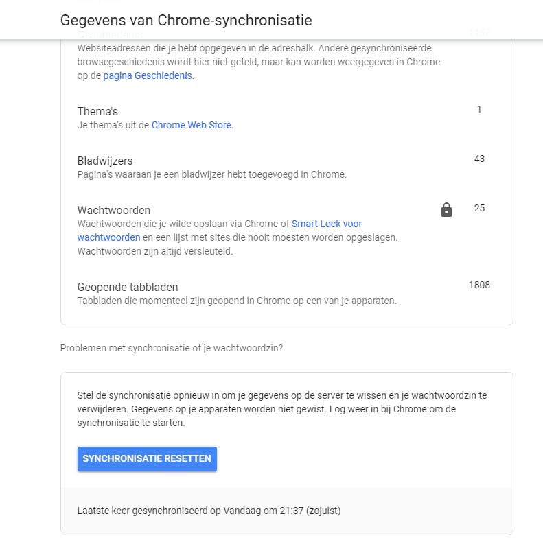 Het kan natuurlijk zijn dat je wel wilt synchroniseren, maar dat je alles dat vóór vandaag is gebeurd liever even verwijdert uit de synchronisatie. Klik in dat geval in het menu Synchronisatie & Google-services op Gegevens van Chrome-synchronisatie en vervolgens op Synchronisatie resetten.