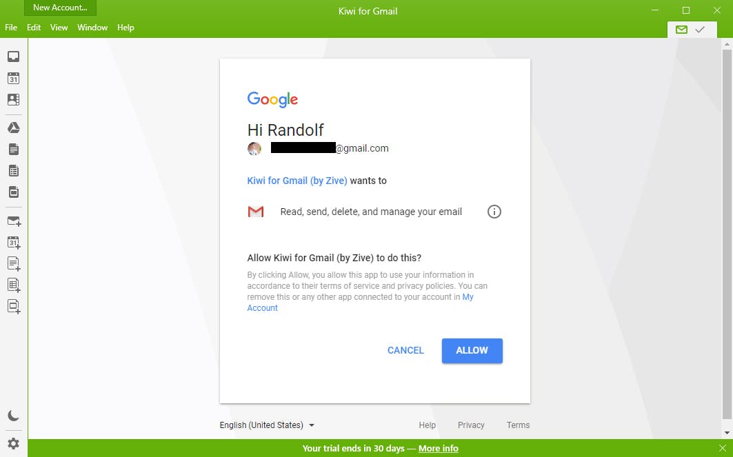 Kiwi vraagt je nu in te loggen met je Gmail-account. Doe dit met je gebruikelijke e-mailadres en wachtwoord. Als je tweestapsverificatie aan hebt staan, dien je ook nog een code in te vullen die per sms toegestuurd wordt. Druk tot slot op Allow om Kiwi toegang te geven tot je account. Dit is nodig zodat de software zijn werk als e-mailclient goed kan doen.