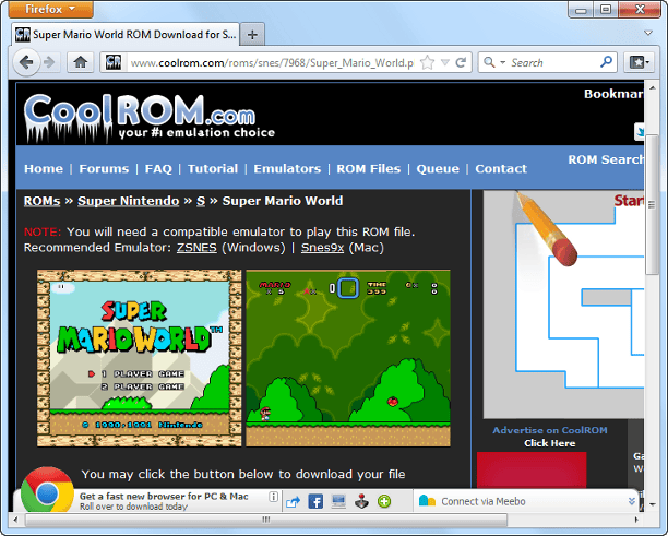 Op de website www.coolrom.com kunt u onder andere een kopie van het videospel Super Mario World downloaden.