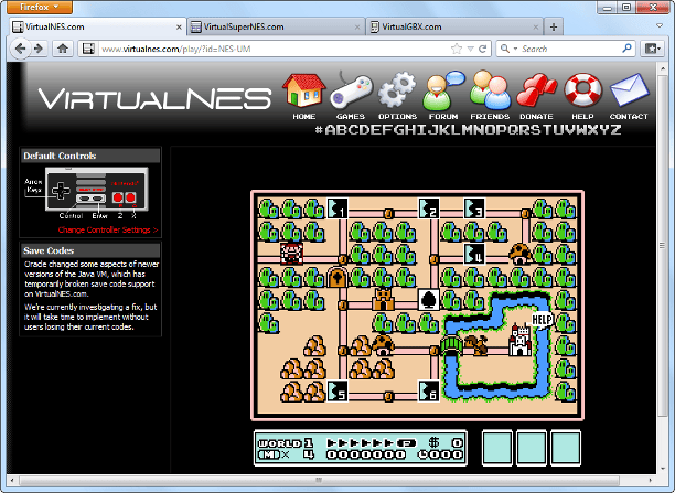 Wilt u liever geen emulators en ROM-bestanden downloaden? Geen probleem, er zijn ook online emulators. Surf bijvoorbeeld eens naar VirtualNES.com, waar u honderden videospelletjes voor de Nintendo 8-bit gratis kunt spelen. Als u bovenaan op GAMES klikt, verschijnt er een overzicht van de 25 populairste titels. Zoekt u een specifieke game? Kies bovenaan de juiste letter van het alfabet. Zodra u een titel hebt gekozen, opent de game direct op de webpagina. Aan de linkerkant ziet u met welke toetsen u het videospel bestuurt. Via Change Controller Settings kunt u de bediening eventueel aanpassen. Ook voor de Super Nintendo 16-bit en Game Boy bestaan dergelijke online emulators. Bezoek hiervoor respectievelijk de websites VirtualSuperNES.com en VirtualGBX.com. Overigens werken de genoemde online emulators alleen als u Java hebt geïnstalleerd. Surf zo nodig naar Java.com om de benodigde software te downloaden.