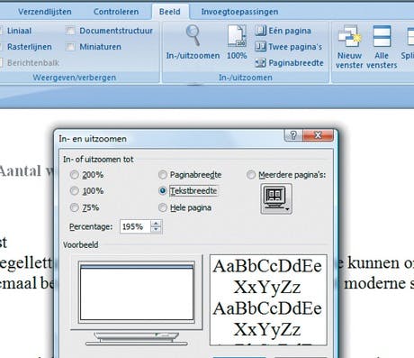 Nadeel is dan weer wel dat er ook koeienletters op papier worden afgedrukt, iets wat lang niet iedereen op prijs stelt. Vandaar dat de paginagrootte (of beter: de vergroting) naar smaak aangepast kan worden. In Word 2007 klikt u in het lint op Beeld en daarna op de knop In/-uitzoomen. In het venster dat daarop opent kunt u kiezen uit een aantal voorgedefinieerde vergrotingen (probeer eens paginaof tekstbreedte, dat scheelt vaak al een hele hoop), terwijl u in het veld achter Percentage net zo ver kunt gaan als u wilt. Let wel: deze vergroting past alléén de paginavergroting aan, de lettergrootte in het document zelf (en dus op de uiteindelijke afdruk) blijft netjes onaangetast.