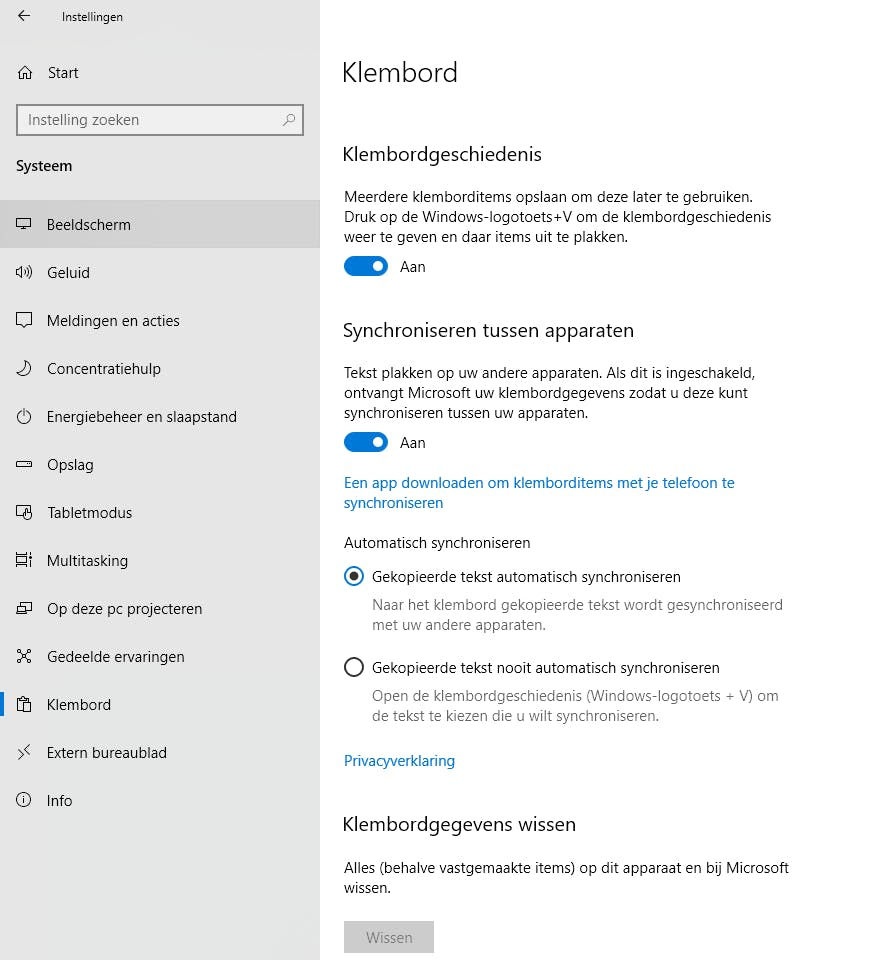 Dankzij de update van 2018 kun je in Windows 10 de geschiedenis bijhouden van alle items die je hebt gekopieerd sinds je de computer hebt opgestart. Op die manier kun je door Windows-toets+V in te drukken teruggaan naar een van de items die je tijdens de werksessie hebt gekopieerd. Toch zijn er goede redenen om die geschiedenis of een deel daarvan te verwijderen. Grote hoeveelheden gegevens op het klembord verminderen de hoeveelheid beschikbaar geheugen. Het klembord kan maximaal 4 MB bevatten en als het vol is, kan je computer trager worden. Het is bovendien mogelijk dat je gevoelige gegevens op het klembord hebt staan. Als je bijvoorbeeld een wachtwoord hebt gekopieerd en geplakt, kunnen anderen het in de geschiedenis terugvinden. De klembordgeschiedenis activeer je door via Start naar de Instellingen te gaan. Daar open je het onderdeel Systeem en dan kun je in de linkerkolom Klembord selecteren om de Klembordgeschiedenis in of uit te schakelen.