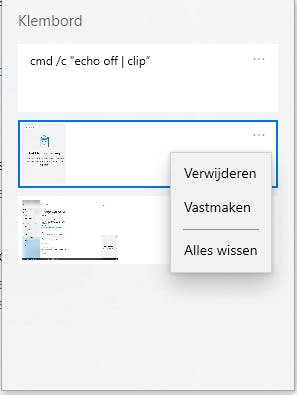 Op deze plaats vind je trouwens ook de knop Klembordgegevens wissen. Natuurlijk is het niet de bedoeling dat je iedere keer in de Instellingen moet duiken om deze data te verwijderen. Dat kan veel sneller vanuit de klembordgeschiedenis zelf. Gebruik de toetscombinatie Windows-toets+V om de klembordgeschiedenis te zien en beweeg de muisaanwijzer over een item. Dan zie je in de rechterbovenhoek van dat item drie puntjes verschijnen. Ga met de cursor over die drie puntjes. Vervolgens is het mogelijk om dat item te verwijderen of vast te maken. De klembordgeschiedenis wordt gewist telkens wanneer je de computer opnieuw opstart, behalve de items die je via de drie puntjes hebt vastgemaakt.