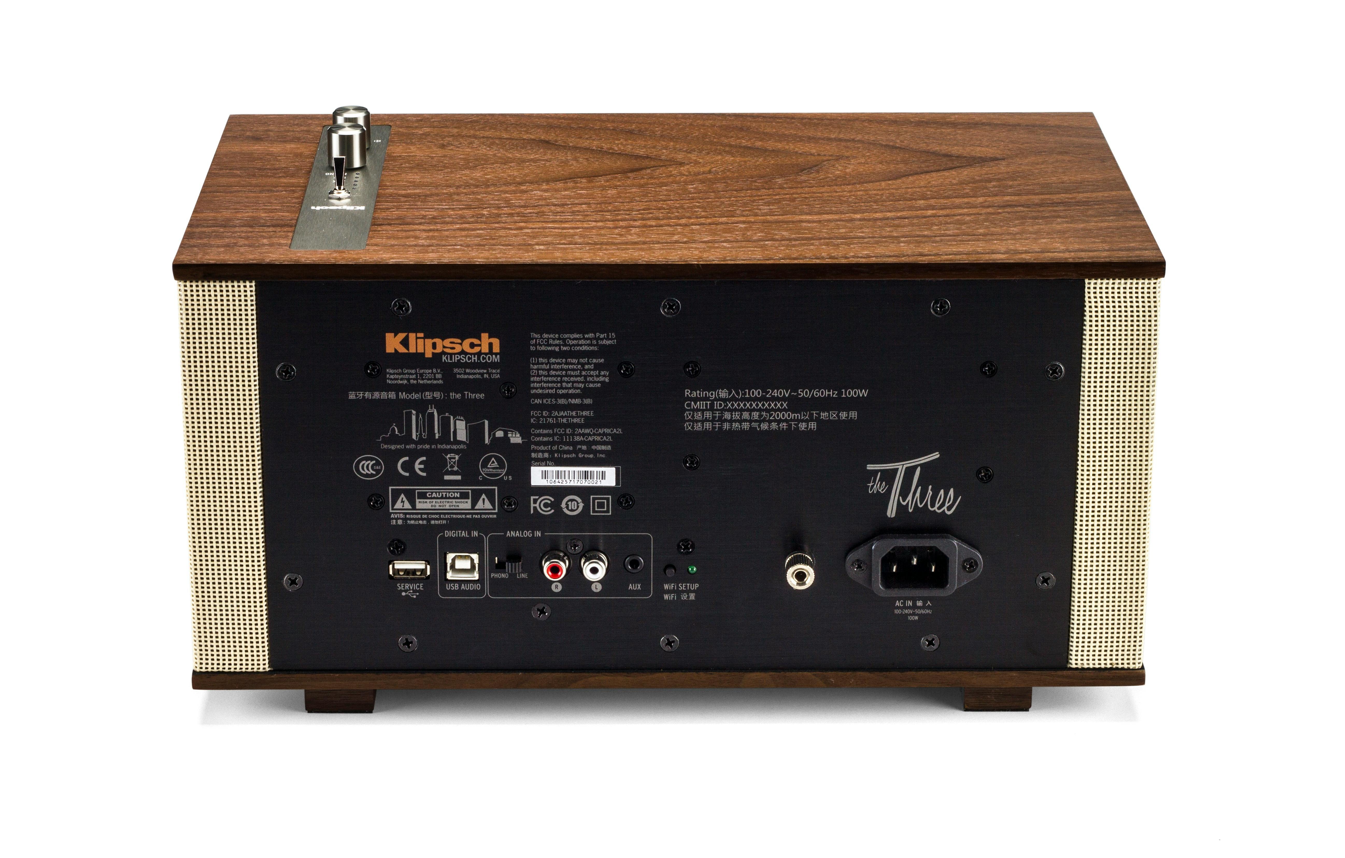 **Prijs** € 549,- **Aansluitingen** Rca-inputs (phono en line), 3,5mm-geluidsingang, usb type b **Draadloos** Bluetooth (aptX), wifi **Piekvermogen versterker** 80 watt **Frequentiebereik** 45 Hz – 20 kHz **Afmetingen** 34,82 × 17,78 × 20,3 centimeter **Gewicht** 4,7 kilo **Website** [www.klipsch.com](https://www.klipsch.com/products/the-three)